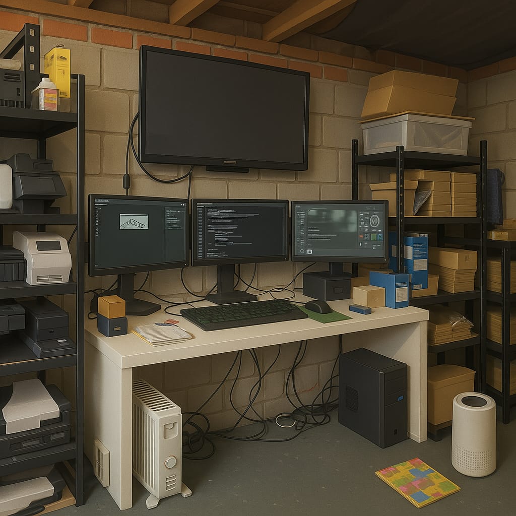 (Yes, the image was AI-generated using a real photo of our studio. It’s not quite that tidy in real life.)